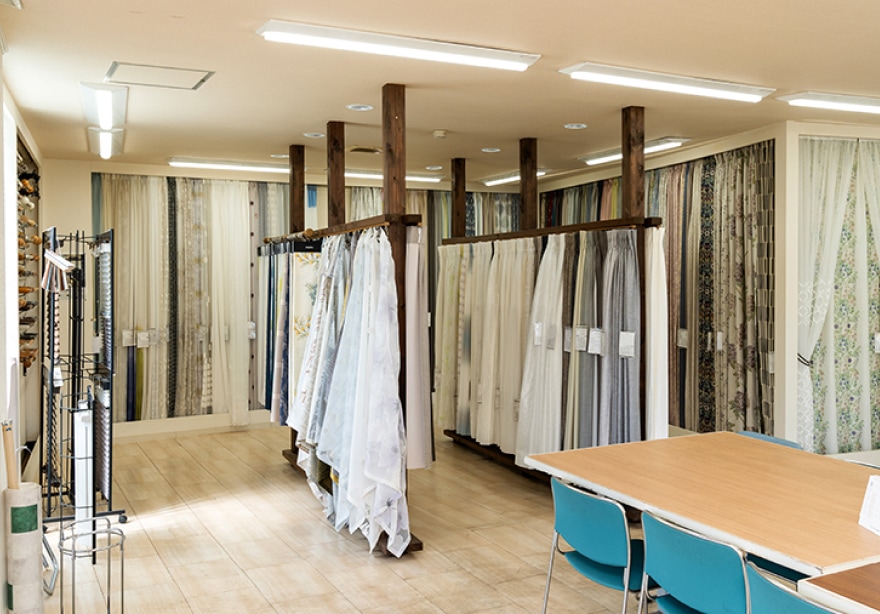 ショールームにはお値打ちなカーテンから高級カーテン、レール、ブラインド、ロールスクリーン、シェード等、約700点以上、カーペット類や雑貨も展示しています。お子様連れのご家族にも安心のキッズコーナーを完備しスタッフと共にカーテン・ブラインド・クロス等、納得いくまでゆっくりお選びいただけます。ご希望のお客様には、店内の見本の貸し出しもしていますので実際にご自宅の窓で合わせてからお決めいただけます。